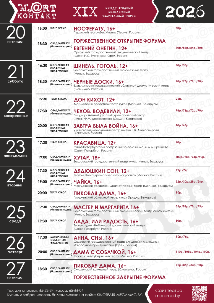 C 20 по 27 марта 2026 года в в XIX раз пройдет Международный молодежный театральный форум «М.@rt.контакт», учредителями которого являются Министерство культуры Республики Беларусь и Могилевский областной исполнительный комитет. Традиционно, в рамках форума состоятся показы спектаклей белорусских и зарубежных театральных коллективов, мастер-классы, творческие встречи, будет организована работа молодежной творческой лаборатории.